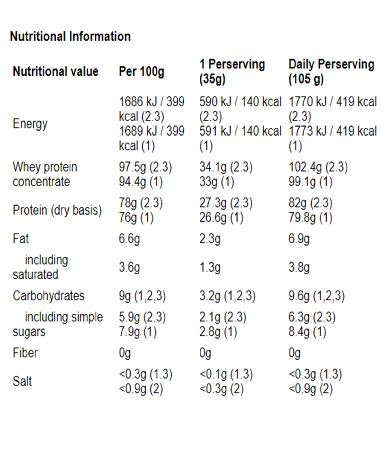 | Whey protein concentrate | 97.5g (2.3) 94.4g (1) |