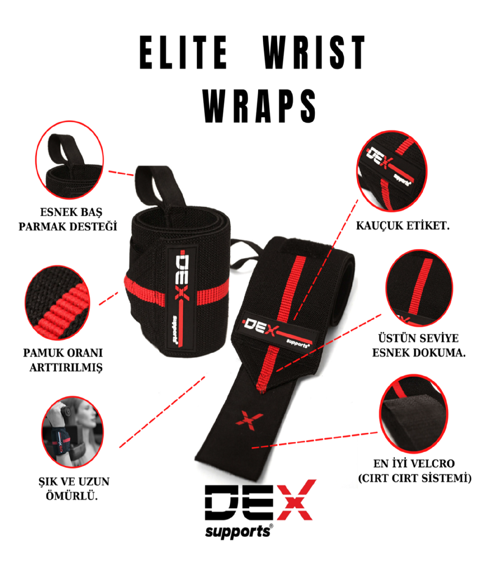 Dex Supports Elite Wrist Wraps Elastik Bilek Sargısı , sporcuların yüksek ağırlıklar altında antrenman boyunca maksimum fayda sağlamasına yardımcı olur. Halter, crossfit ve powerlifting gibi egzersizlerde bileğinizi korur.Bilekleri destekleyen, tekrarlar sırasında bilek yorgunluğunu en aza indirmeye yardımcı olan ve bilekleri sakatlanmalara karşı koruyan Dex Supports Elite Wrist wraps.