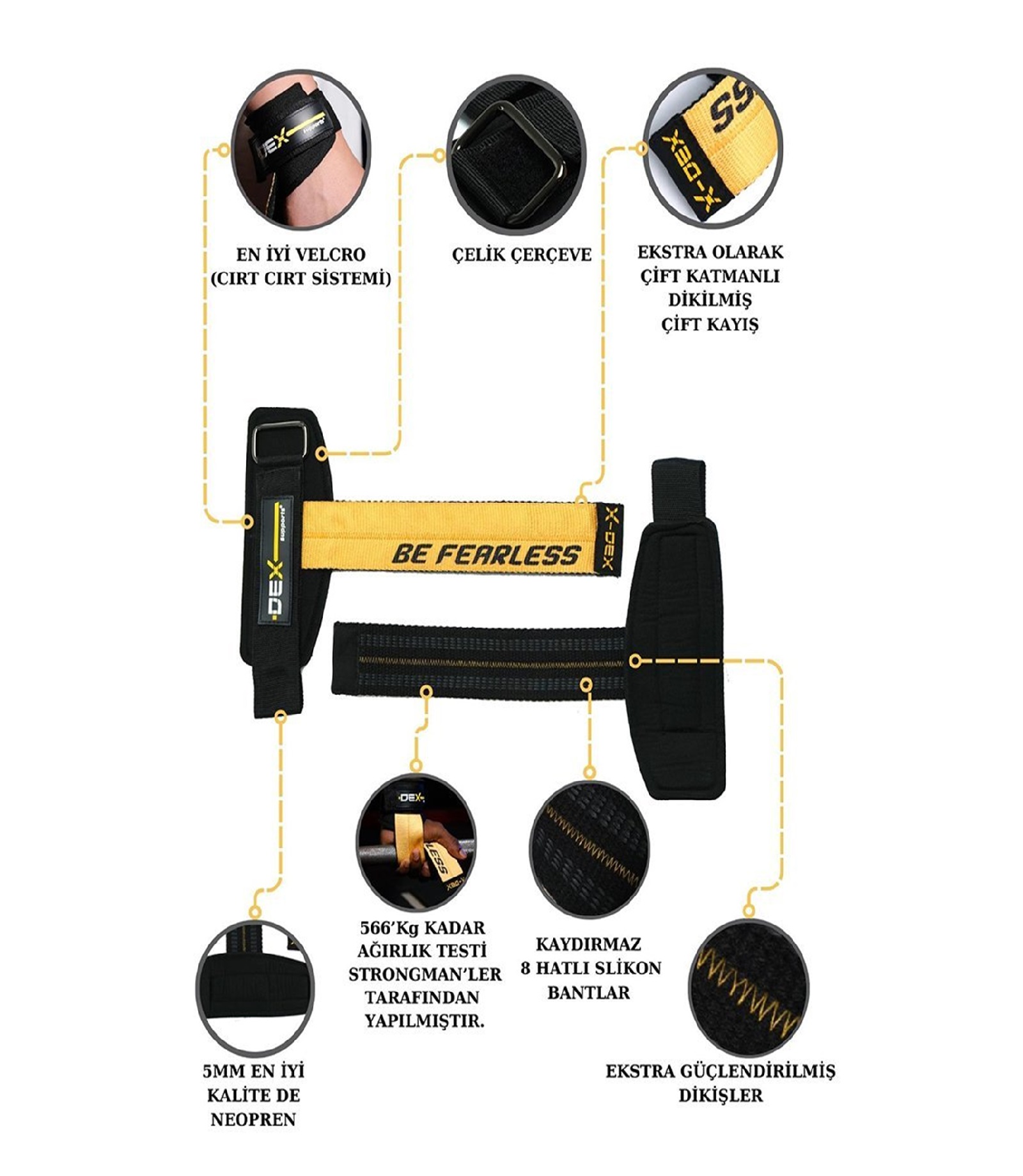Sizlere vücut geliştirme teknolojisinde  yeni bir başarı sunan , dikkat çekici şık tasarıma sahip    Dex Supports  T-Grips  Lifting Straps  sunuyoruz. Bu kayışlar  ellerinizi korur , kavramayı arttırır,   bileklerinizi destekler  ve  antrenman boyunca uygulayacağınız  tüm hareketler için kullanılabilir.Ağırlık altında endişe ve strese girmeden daha büyük kas gruplarına  konsantre olabilirsiniz .  Kavrama gücünüz veya kavrama yorgunluğunuz  hakkında  bir  endişe  duymanıza gerek kalmadan  tüm antrenman boyunca tam konsantre olabilecek  ve  %100 performans sağlayabileceksiniz.
