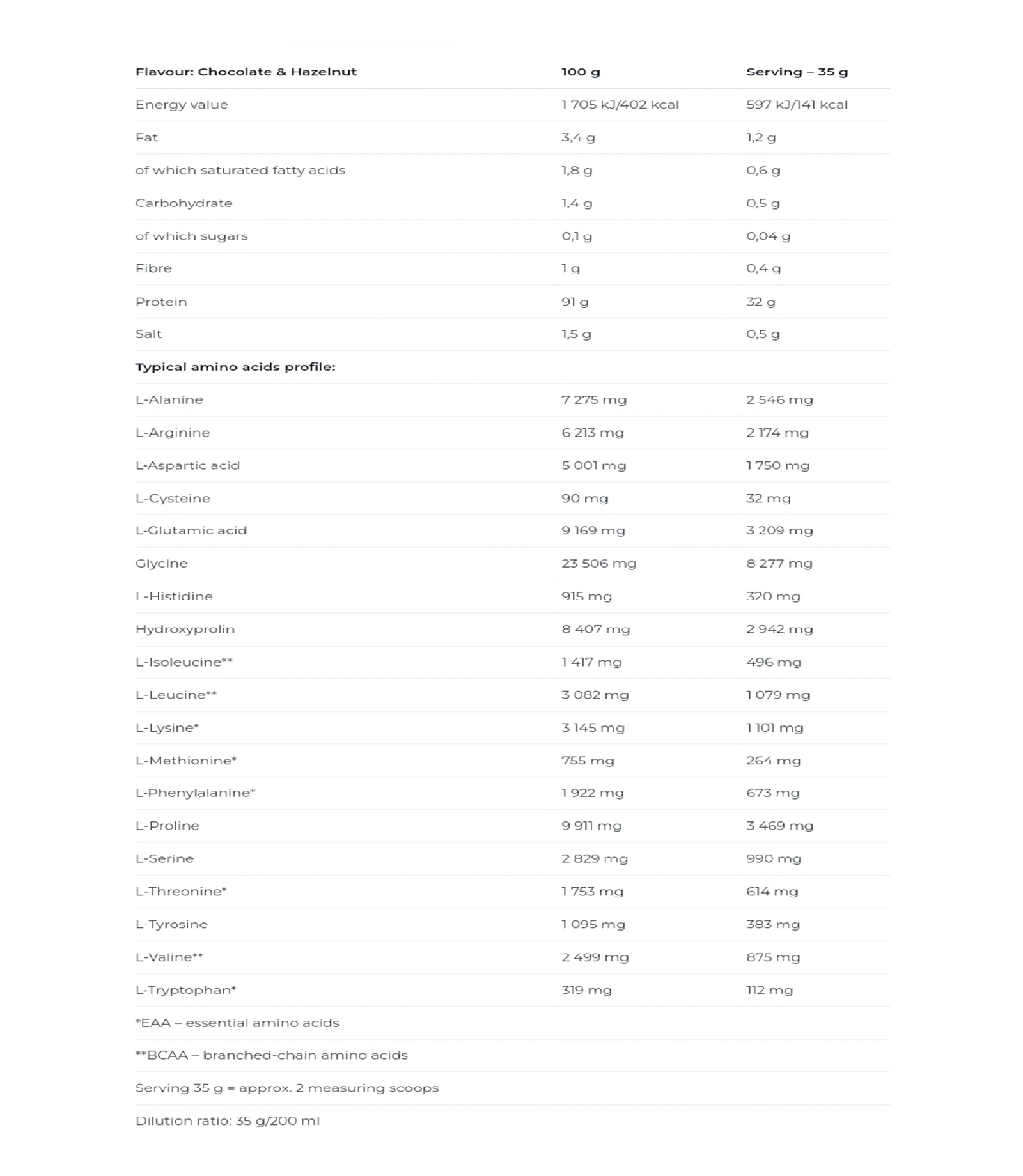 35 g'lık porsiyonu (yaklaşık 2 ölçü kaşığı) 200 ml suyla karıştırın. Günlük protein ihtiyacınıza bağlı olarak öğünler arasında günde 1–3 porsiyon tüketin. Önerilen dozu aşmayın. Açıldıktan sonra 25 °C'yi aşmayan bir sıcaklıkta saklayın ve 3 ay içinde kullanın.