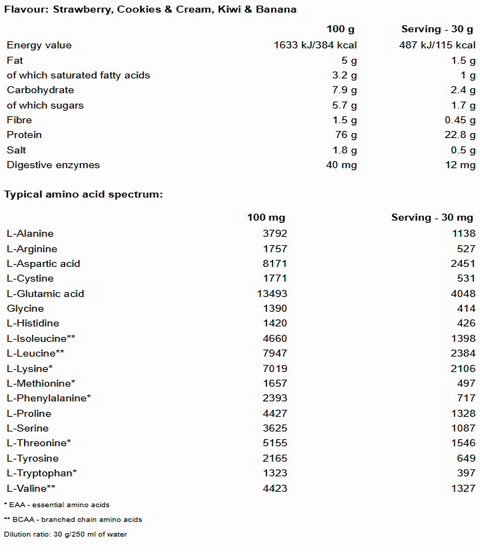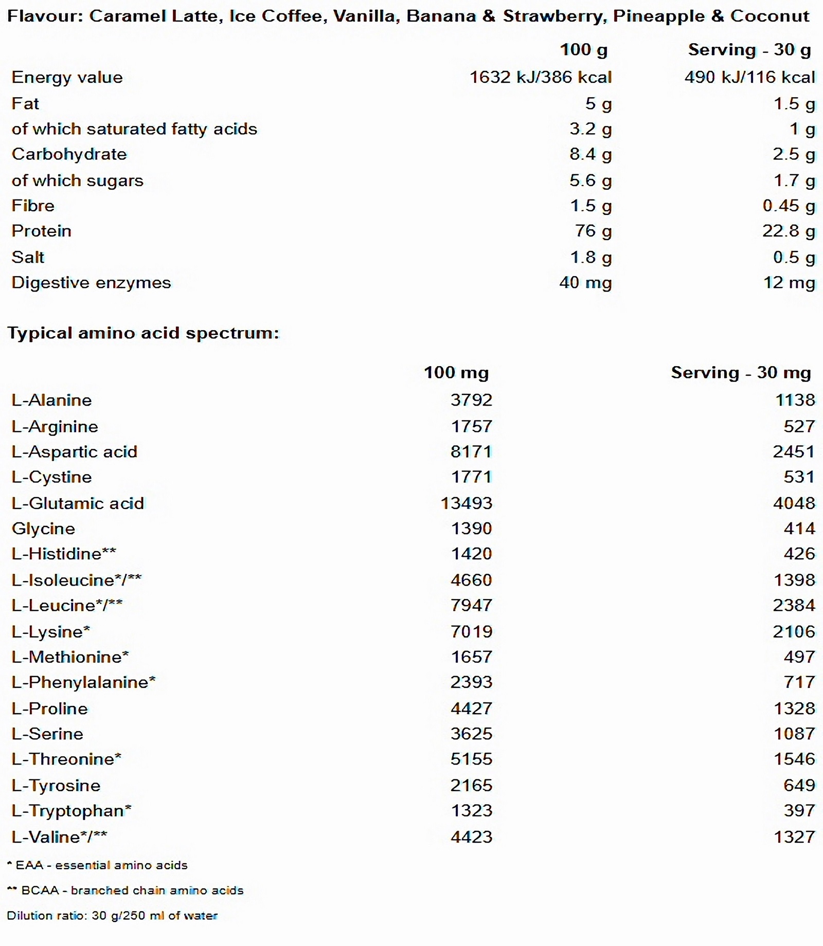 Bu ürünün temeli, birinci sınıf ultra filtrelenmiş peynir altı suyu konsantresi (WPC) ve en saf peynir altı suyu protein izolatından (WPI) yapılmıştır .