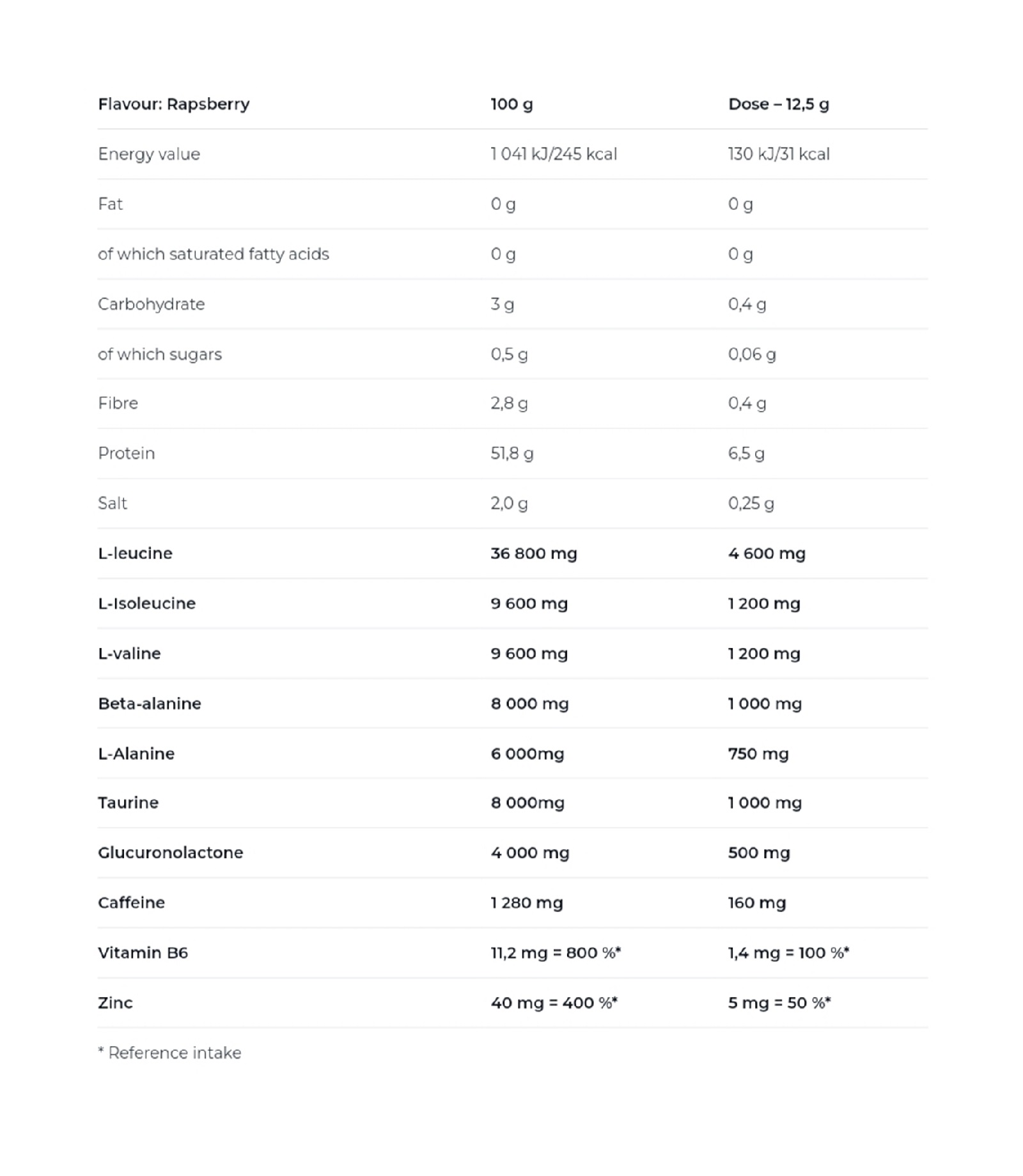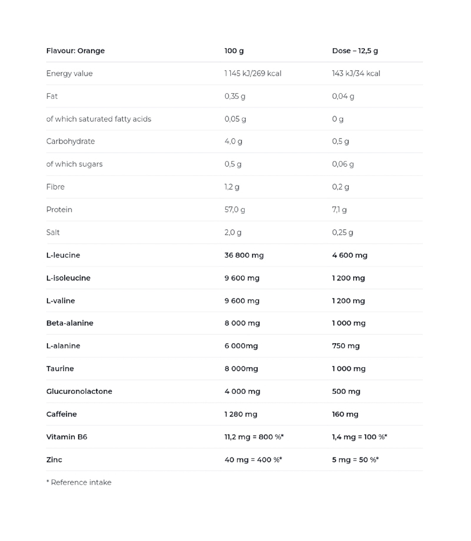 Bu üstün ürün, anında formda olağanüstü bir aktif madde kombinasyonu içerir. Ürünün temel bileşenleri, temel dallı zincirli amino asitler L-lösin, L-izolösin ve L-valindir. Bu dallı zincirli asitlerin oranı L-lösin için 4:1:1'dir.