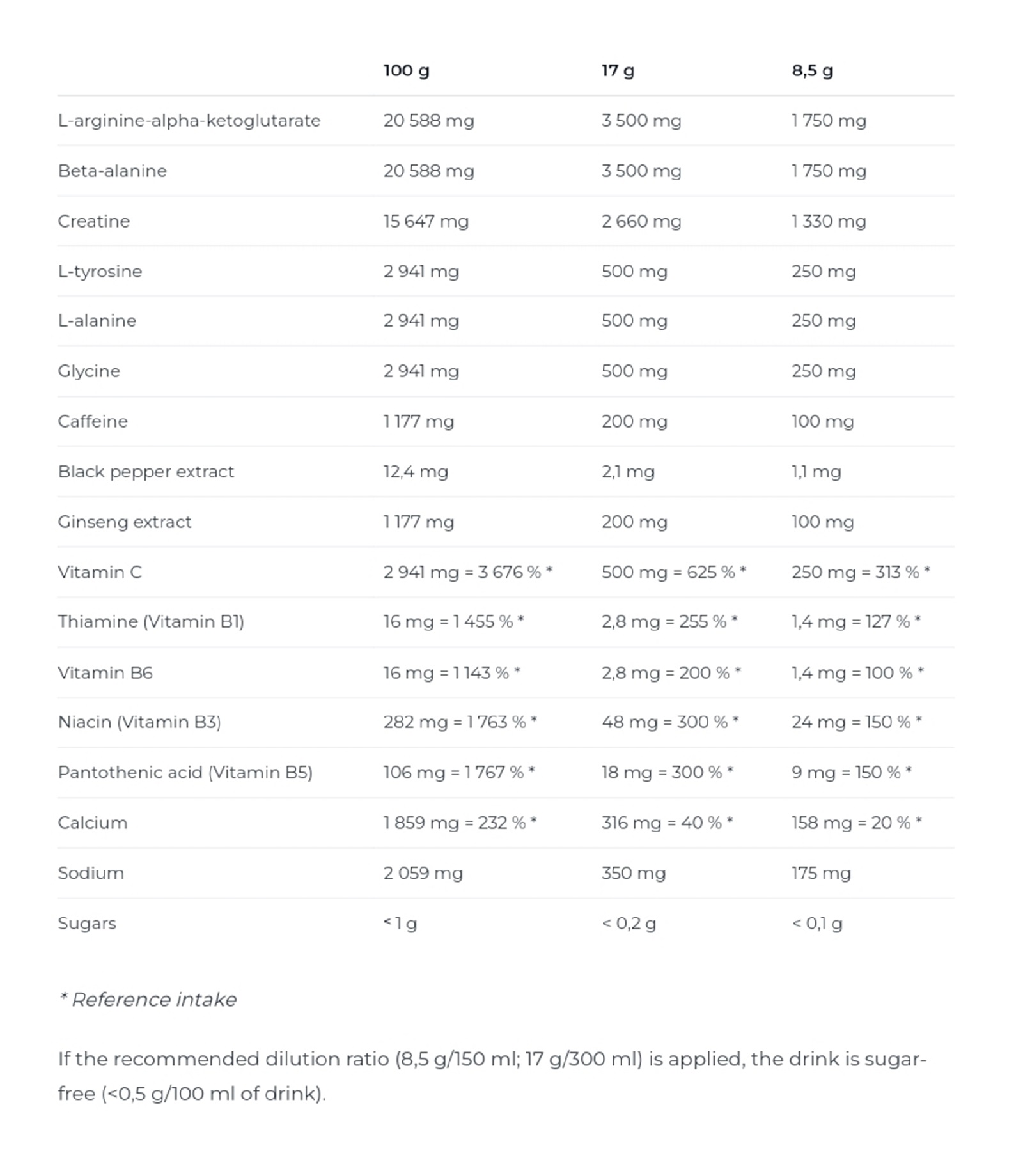 Vücut ağırlığının 75 kg'ına kadar ve hassas sporcular için 150 ml suya 8,5 g'lık bir doz karıştırın. Vücut ağırlığının 75 kg'ından fazlası veya yüksek yeterlilik antrenmanları için 300 ml suya 17 g'lık bir doz karıştırın. Antrenmandan 30 dakika önce tüketin. Önerilen dozu aşmayın.