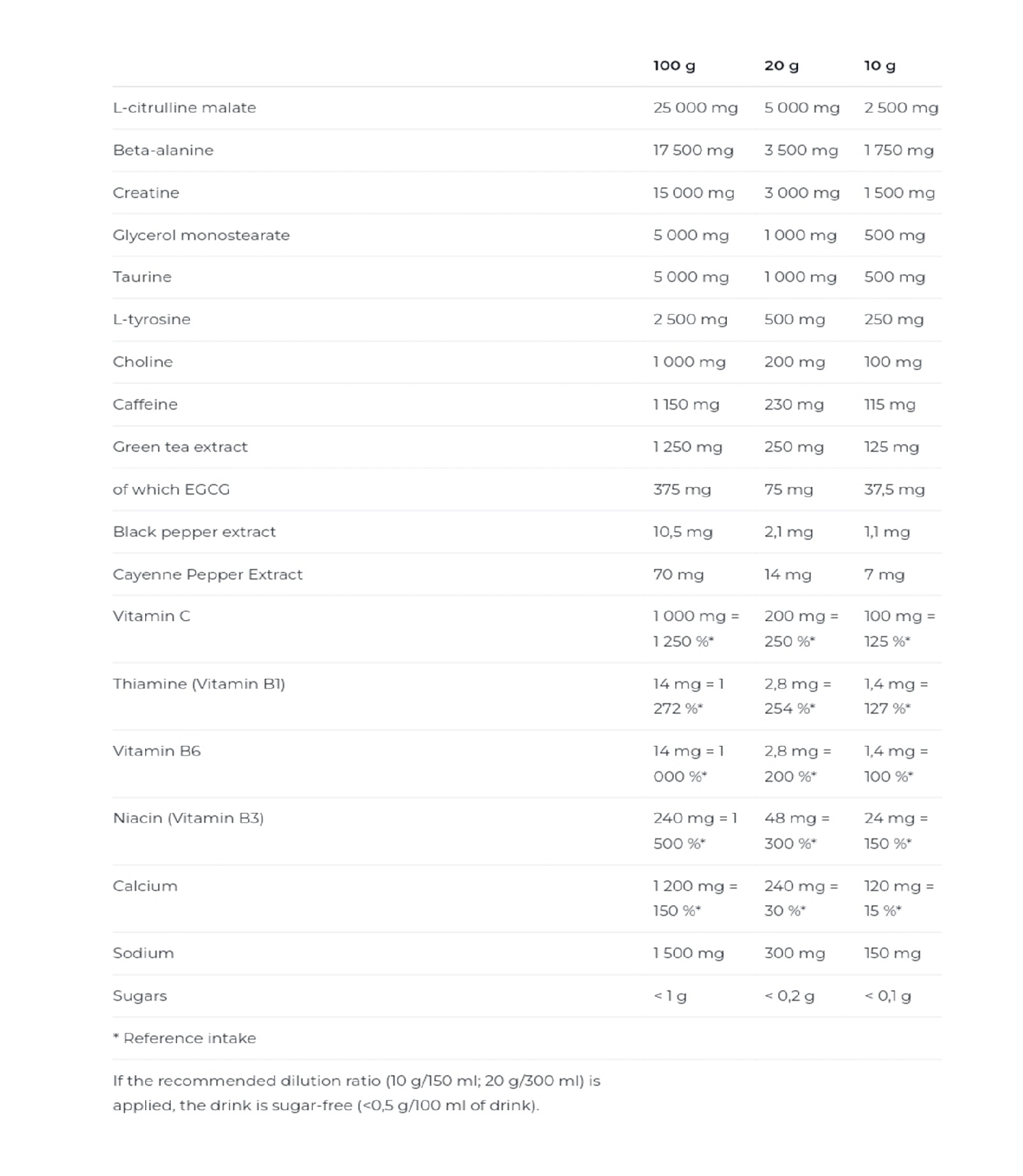 75 kg vücut ağırlığına kadar ve hassas sporcular için 10 g'lık bir dozu 150 ml su ile karıştırın. 75 kg'ın üzerinde vücut ağırlığı veya oldukça ileri performans için 20 g'lık bir dozu 300 ml su ile karıştırın. Antrenmandan 15 dakika önce tüketin. Maksimum günlük doz 20 g'dır. Önerilen dozu aşmayın.