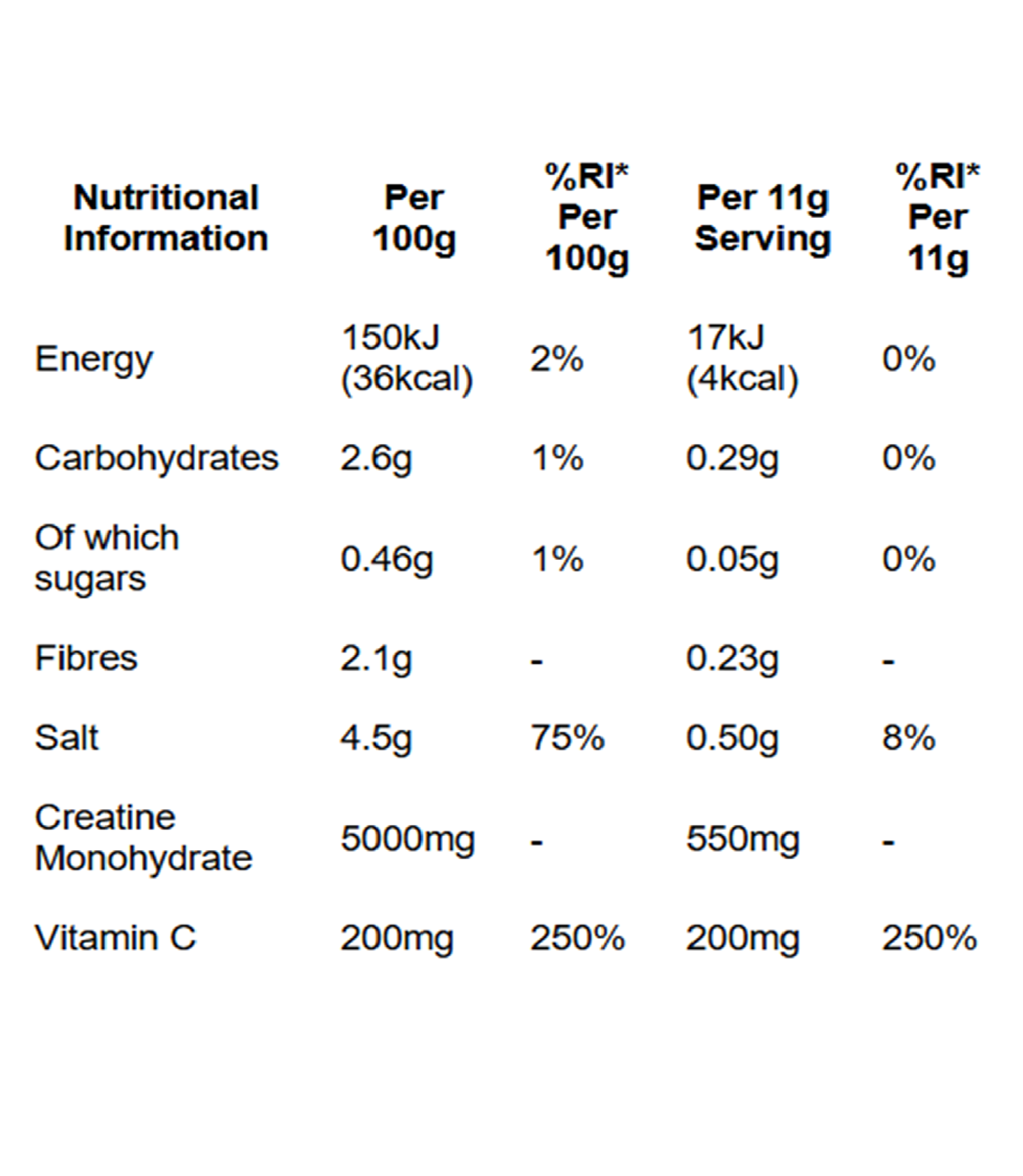 | Nutritional Information | Per 100g | %RI* Per 100g | Per 11g Serving | %RI* Per 11g |