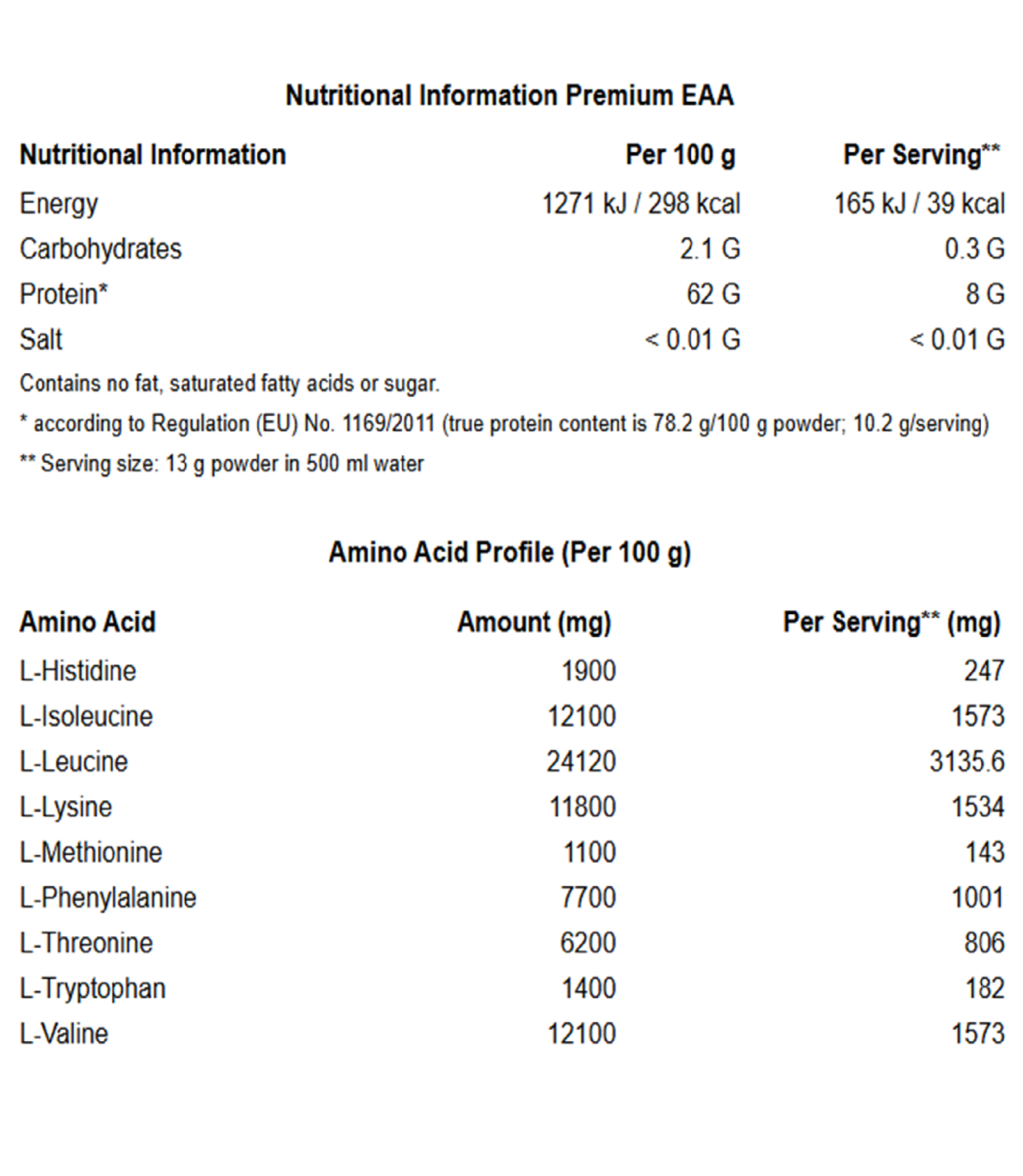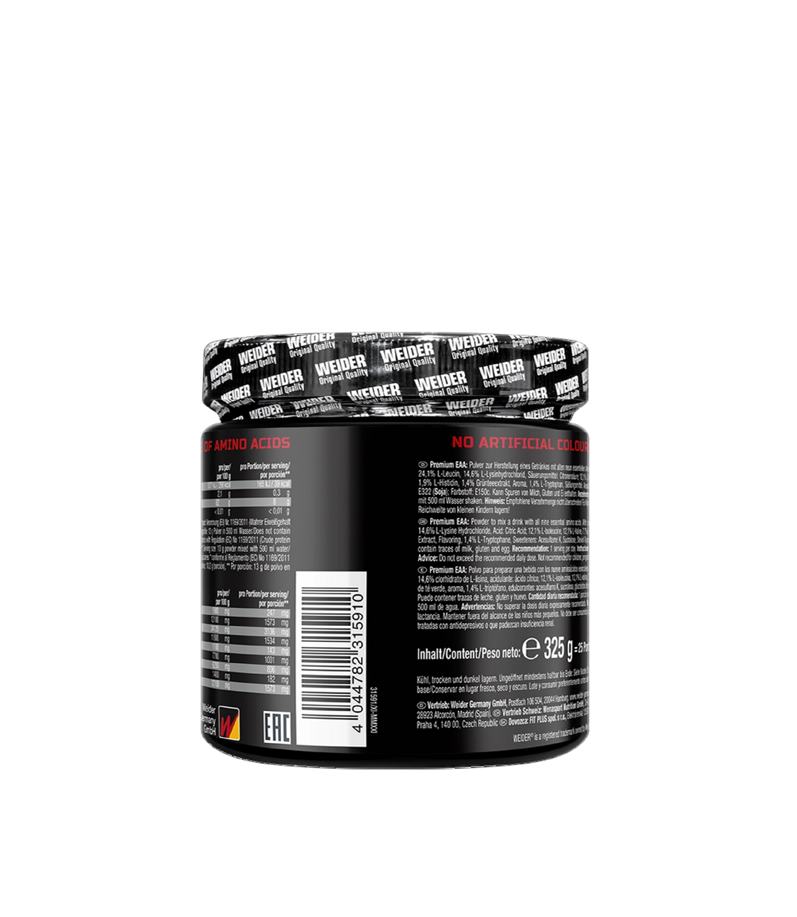 Amino asitler, insan vücudunda çok sayıda önemli işlevi olan proteinlerin temel yapı taşlarıdır; ayrıca kaslarımızın yapı taşlarıdır. Bu aminoasitlerden dokuzu vücut tarafından üretilemez. Bu nedenle bunların düzenli olarak gıdalarla karşılanması gerekir. Meyveli-taze premium EAA tozumuz porsiyon başına 10 gr'dan fazla serbest formda esansiyel amino asit sağlar. Premium EAA Zero pudrası, yüksek kaliteli bileşimiyle tüm hırslı amatör sporcular, profesyonel sporcular ve vücut şekline dikkat edenler için idealdir.